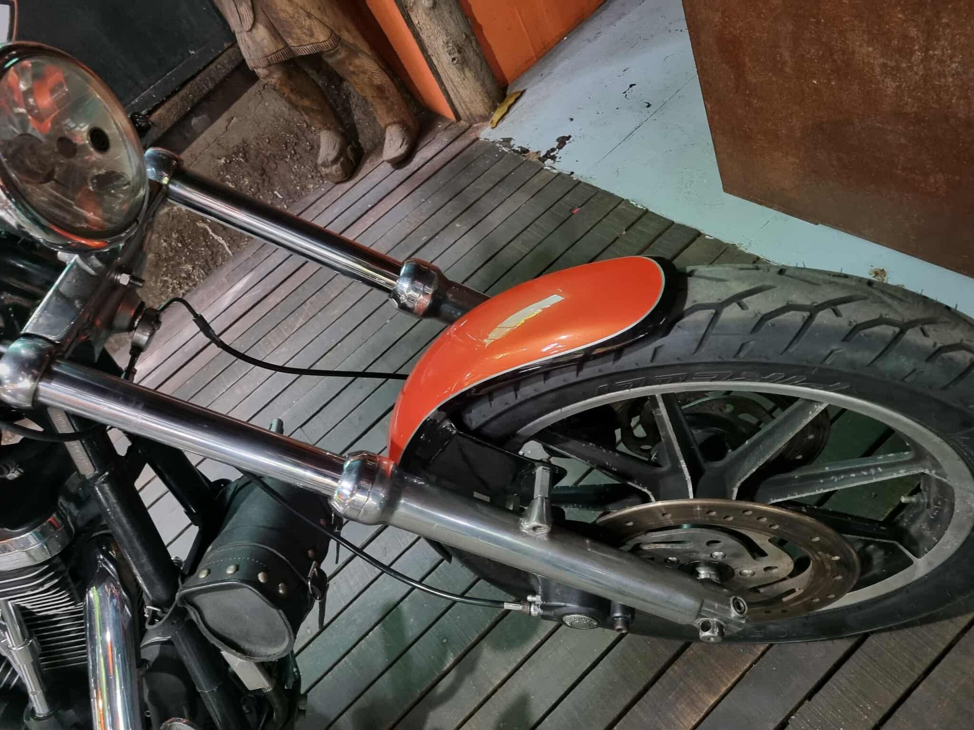 - Wide handlebars, raked-out front fork, round chromed headlight